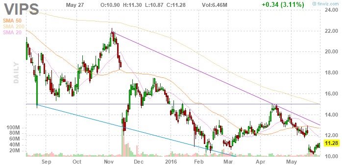 从技术分析上看,VIPS受整体中概股影响暴跌后多次试探,底部支撑明显,可以在10.5美元附近布局多仓,止损放在10美元以下。
