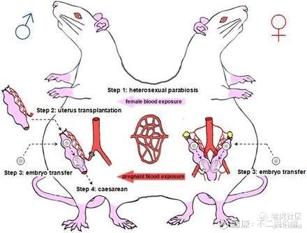 实验过程中,研究人员将一只雌性大鼠和一只雄性大鼠背靠背连接在一起,即成为一个连体儿,使它们能够共享血液。然后将另一只雌性大鼠的子宫移植到连体雄性大鼠体内。