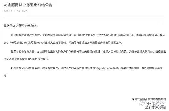 2021年6月28日,友金服官网发布公告称,截至2021年6月27日,我司已100%对出借人完成了兑付,并按照有序退出方案进行资产清收及处置工作。