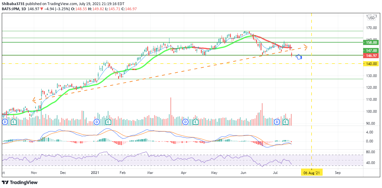 Earnings is above expectation but it didn't pop $JPM above $158 which has become a resistance level. Yesterday it broke $147 briefly and closed at $146.97. This bearish candle could be the start of a down trend as it has broken the up trend line since Nov 2020. With overall market sentiment bearish for this week, a correction could be imminent too. If it doesn't find support at $147, it's time to consider a put.