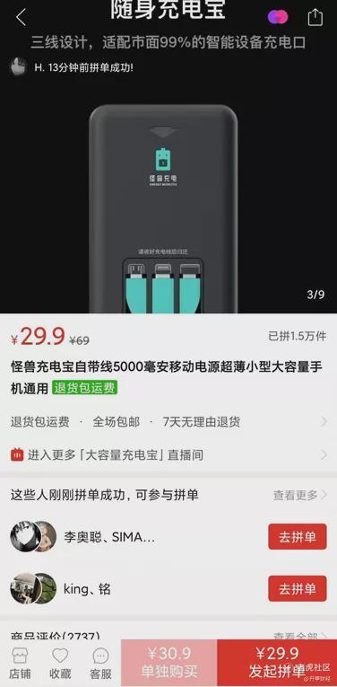让探长大跌眼镜的是,怪兽充电宝在拼多多售价只要29.9元,外观与商户借来的怪兽充电宝一致,目前销量高达1.5万件。