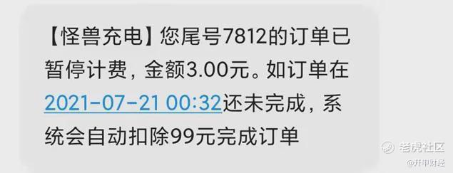 由于晚上很多商家已经关门,且附近没有怪兽充电门店,探长在微信小程序中反馈“附近没有可归还门店”。很快,探长收到来自怪兽充电发来的短信提示,您尾号7812的订单已暂停计费,金额3元。如订单在2021年7月21日00:32还未完成,系统将自动扣除99元完成订单。
