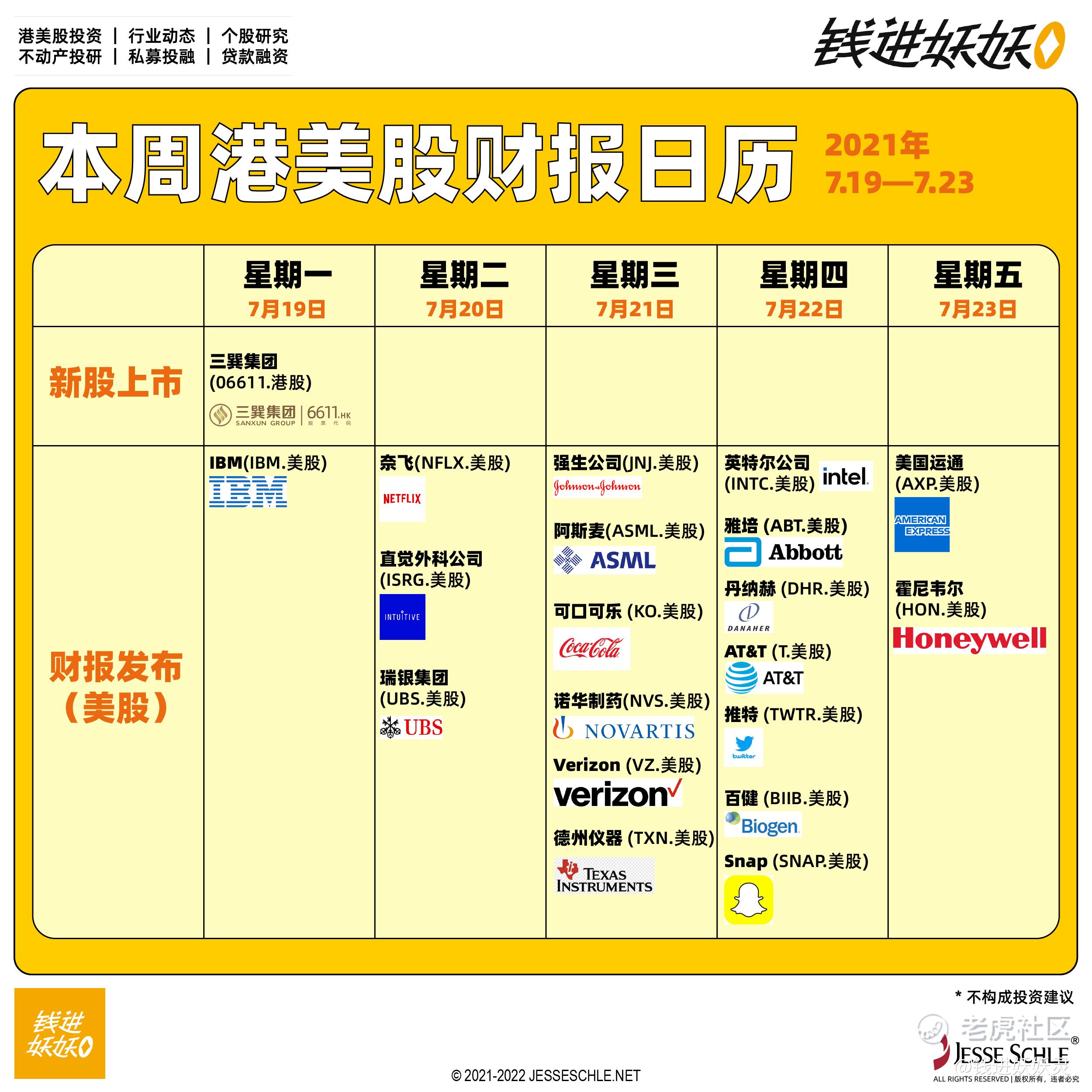 【小妖灵港美股日历】本周美股二季度财报季会迎来高峰,可关注财报结果和日内变动,注意风险