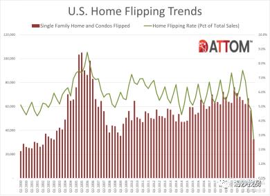 2021年第一季度,全美房屋交易里共有32,526独栋屋和公寓是旧房翻新的,占所有出售房屋的2.7%。