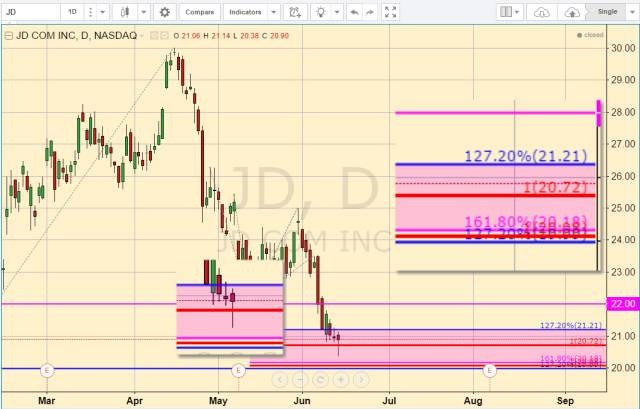 第一, 我的交易体系里面, 没有追涨杀跌. 我不会在一只股票大涨的日子买股票, 也不会在一只股票大跌的日子卖股票. JD这张图, 我一次都没有修改过. 上面非常清楚 - 21.21是第一个支撑, 没有守住. 20.72是第二个支撑, 今天虽然日内击穿, 但是也并没有收在下方. 对于热衷于给K线取名的一些朋友们, 今天的这根K线叫做hammer, 而hammer是一种潜在的反转形态. 做空JD的朋友, 给你们提个醒, 不要让一笔赚钱的交易变成一笔亏钱的交易. #中概股崛起#