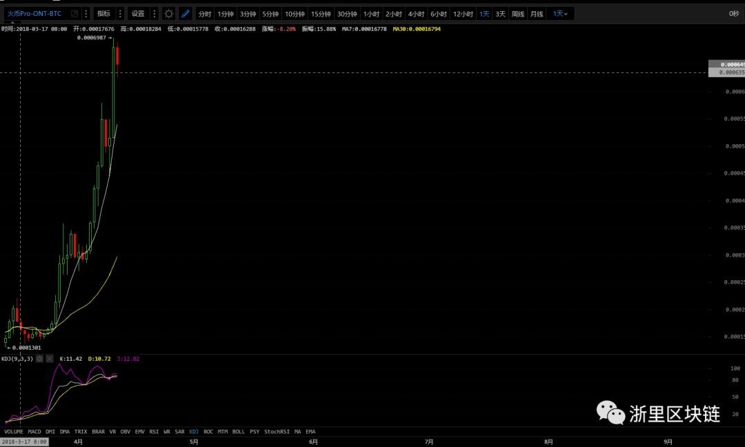 先谈ont,本体被小蚂蚁的粉丝誉为真的neo,本体的话初期大量筹码都在庄家手上,这个庄家也不用我说了。短期的话日线上的风险已经在加剧,kdj指标显示超买,超买的意思就是短期追涨资金较多,在这种情况下就算不出货的话也会面临大幅度的调整风险。