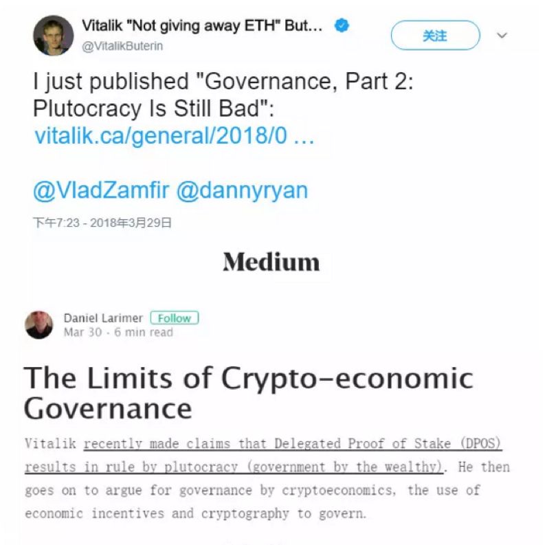 上文提到,3月底BM和Vitalik已经针对EOS节点投票展开了中心化和去中心化的隔空辩论。