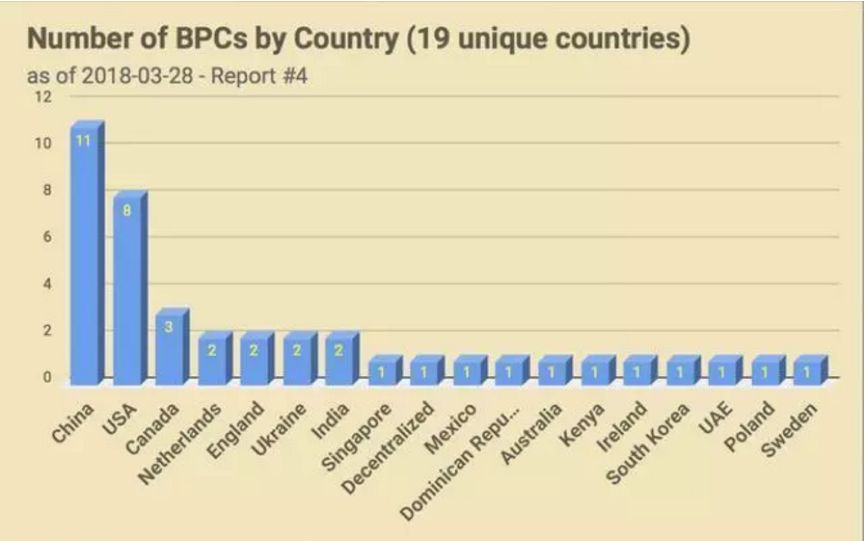 上图可知,在EOS超级节点竞选中,中国有11个候选者,目前排在第一位,紧随其后的是美国(8个),加拿大(3个)。