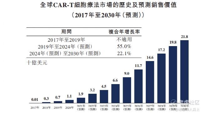 按销售价值计,全球CAR-T市场规模已从2017年的0.1亿美元增长到2019年的7亿美元,预计全球CAR-T细胞疗法市场的销售价值达至2024年的66亿美元,2019年至2024年的复合年增长率为55.0%。截至2030年,按销售价值计,全球CAR-T市场规模预计达至218亿美元,2024年至2030年的复合年增长率为22.1%。