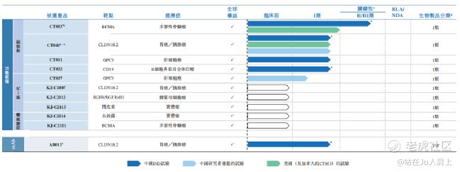 公司的唯一核心候选产品CT053用于治疗 R/R MM(一种血液恶性肿瘤),在公司管线产品中的其他候选产品中,CT053处于最成熟阶段。除CT053、CT032及KJ-C2111外,公司管线中的所有其他候选产品均于用于治疗实体瘤,正处于Ib期临床试验或更早阶段。下图概述截至最后实际可行日期,公司的管线以及各候选产品的开发状态。