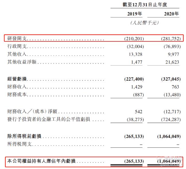2019年和2020年两个公司未有营业收入,其研发开支分别为人民币2.10亿和2.82亿元,同期净亏损分别为人民币2.65亿和10.64亿元。