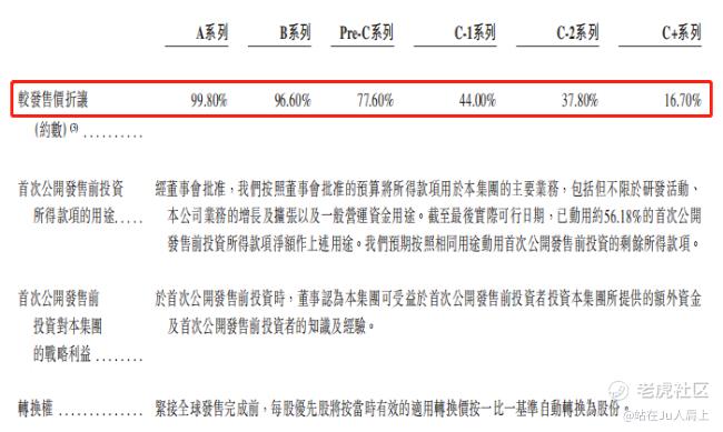 2014年成立至今,公司共进行了六轮融资,分别是A系列、B系列、Pre-C系列、C-1系列、C-2系列及C+系列,融资额分别为163万美元、3,000万美元、6,000万美元、7,000万美元、1.16亿元及1,000万美元。较发行价折让分别是99.8%、96.6%、77.6%、44%、37.8%、16.7%,六轮融资累计筹得2.876亿美元。前期优先股占比约为45.83%不设禁售期!