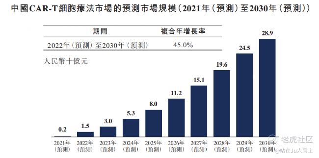 目前,中国国家药监局并无批准任何CAR-T细胞疗法上市。预计首批CAR-T细胞疗法将于2021年获得国家药监局批准并在中国推出,估计该年中国CAR-T疗法的市场规模为人民币2亿元。预计2024年将增长至53亿元,并进一步增长至2030年的289亿元,2022年至2030年的复合年增长率为45.0%。