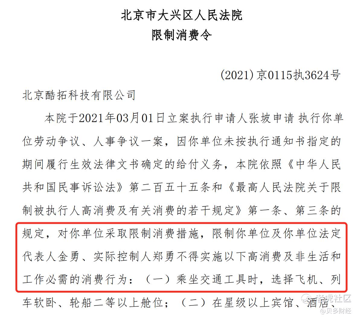 根据工商信息系统,郑勇为酷拓科技系列公司的实际控制人、董事。因申请人申请执行单位劳动争议,该公司未及时履行给付义务。因此,法院对酷拓科技系列公司采取限制消费措施,并对金勇、郑勇下发限制高消费令。