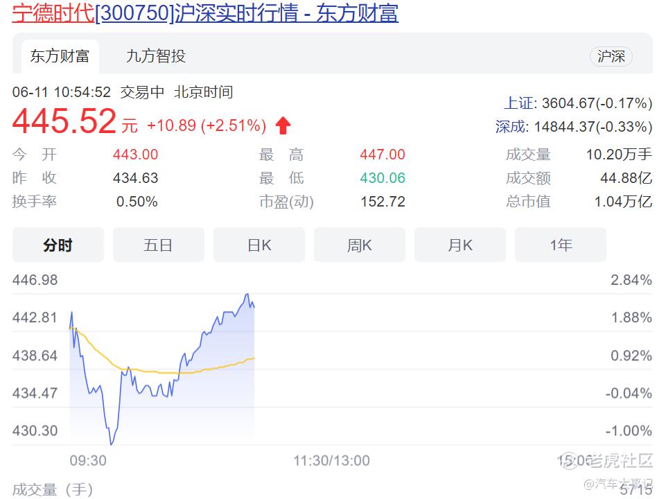 截止发稿前,6月11日宁德时代股价涨2.51%,报445.52元,市值仍然坚挺在万亿以上。