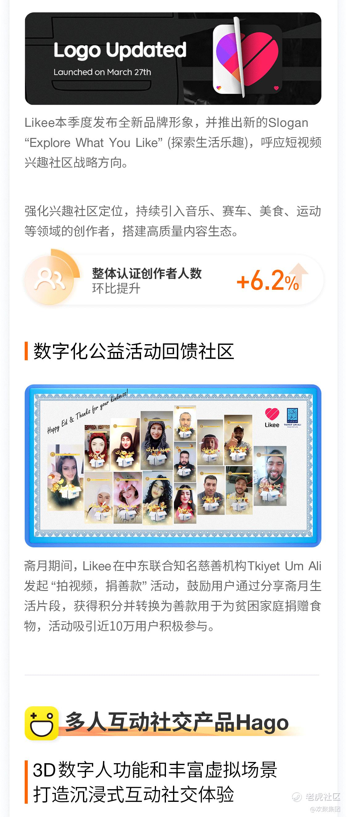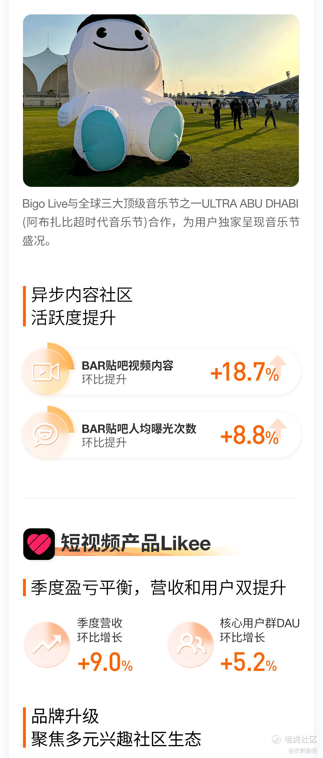 ② 多元、优质的内容和丰富的本地化运营,持续驱动用户高质量增长。本季度,全球社交娱乐MAU环比提升1.9%;Bigo Live全球用户增长强劲,MAU同比增长19%,Likee核心用户群DAU环比增长5.2%;