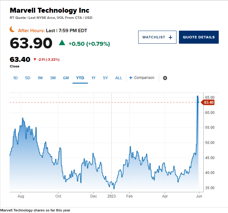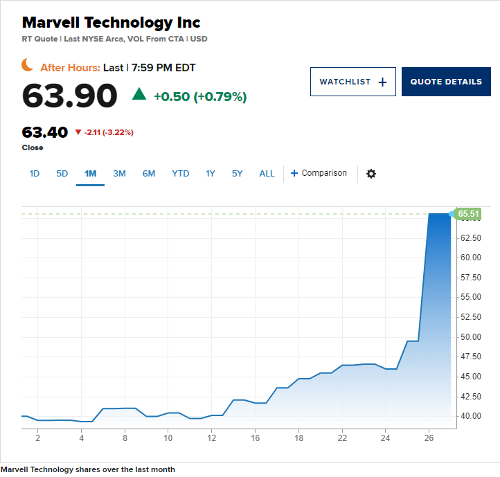 Marvell Technology今年受到了一些AI利好的推动,今年大涨了约71%。上周五,这家公司公布了好于预期的营收和收益,股价大涨超过32%,创下有史以来的最佳表现。该股本月上涨超过61%,有望创下自2001年以来的最佳月度表现。