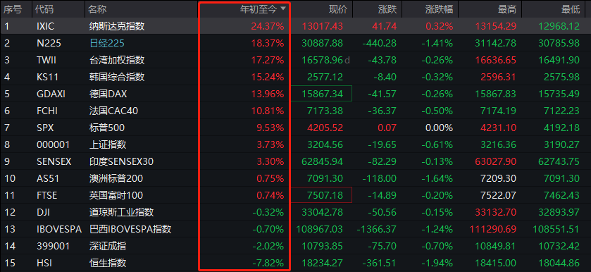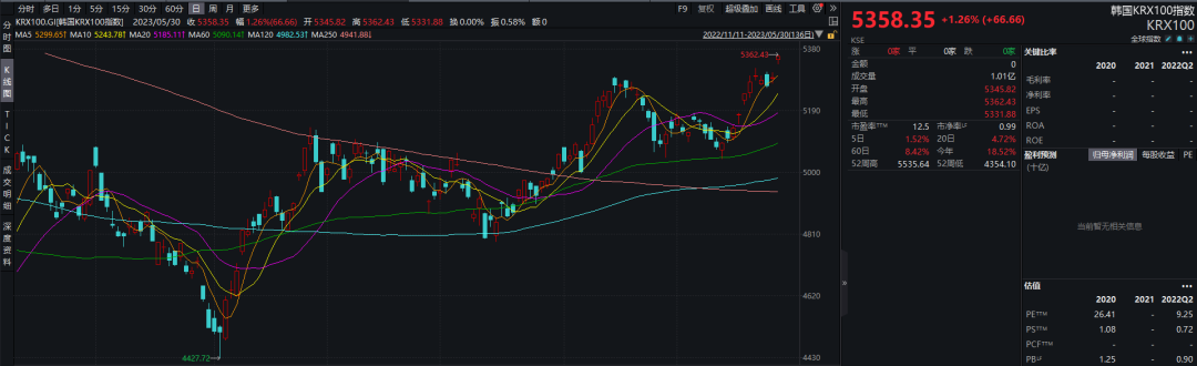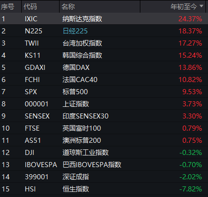 4、韩国综合指数,年初至今涨幅为15.24%。