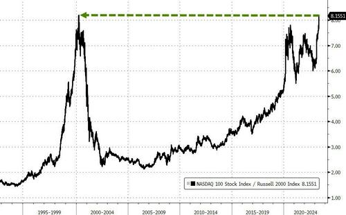 然而,当前纳指的科技大盘股,相对于罗素2000小盘股的比率趋势直逼历史极值。上一次达到该位置时是2000年的互联网泡沫。