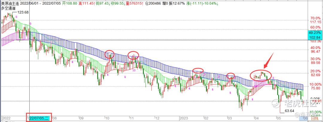 如上图所示,原油价格自2022年07月05日破位之后,日线级别一直都是空头趋势好不好?其中在2022年10月和11月,2023年1月,2023年3月曾四次试图突破趋势,最终均宣告失败。而最后的那一次突破并短暂站稳趋势,则是借助当时沙特突然宣布减产的基本面,也就是许导前文《0403:还是熟悉的一幕,只不过这一次挨雷劈了!》谈到的事情,而后发生的就是《0421:君子报仇,三周不晚!》。