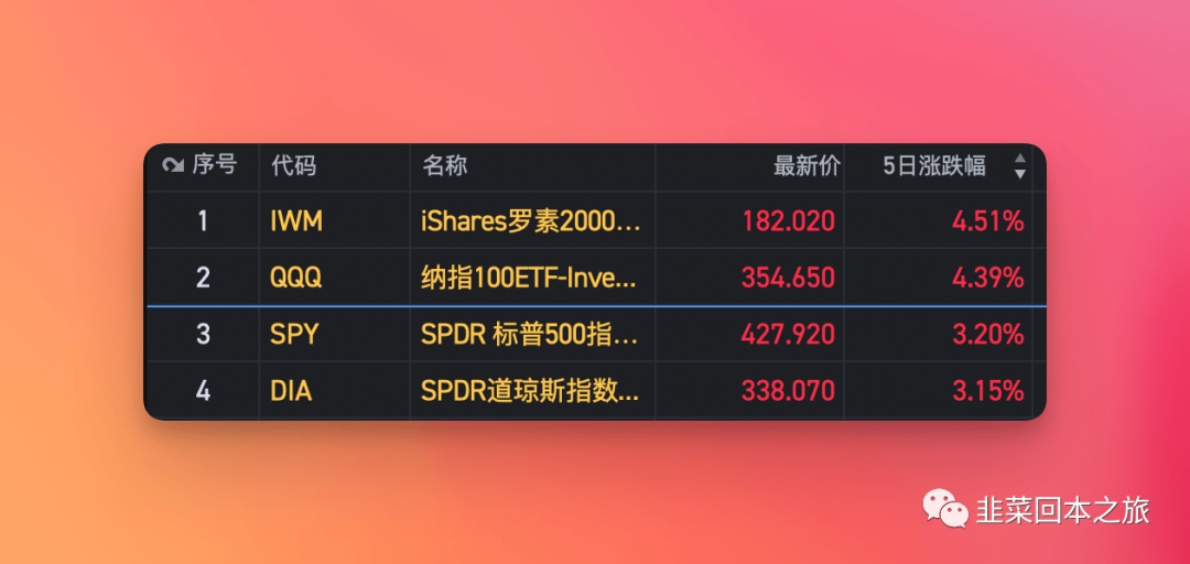 不构成投资建议。QQQ 有涨幅“见顶”的迹象了,IWM 有突破横盘的迹象,可以重点关注。现在应该没人看空美股了吧?上周我就已经觉得美股牛市来了,祝福买 CALL 的朋友,回调就是上车机会。
