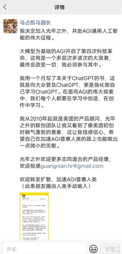 无独有偶。3月28日,有着搜狗输入法之父之称的马占凯日前在社交平台上宣布加入光年之外,共赴AGI通用人工智能的伟大征程。马占凯表示,“我从2010年起就是美团的产品顾问,光年之外的联创团队让我又看到了像美团初创时朝气蓬勃的景象,这让我倍感信心,希望自己在加速AGI普惠人类的路上也能做出一点微小的贡献。”