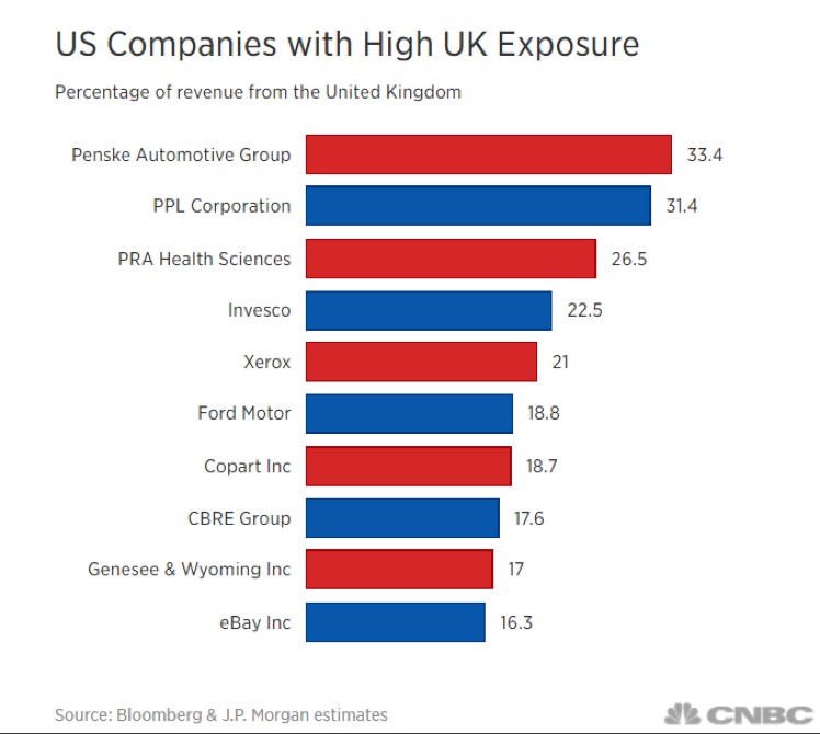 公 投之夜,战况激烈。退欧派(蓝色)领先趋势已大定。TLS美股研究在此介绍两只营收对英国敞口最大的美股,其中已经排除了以ADR形式在美国上市交易的海外公司。
