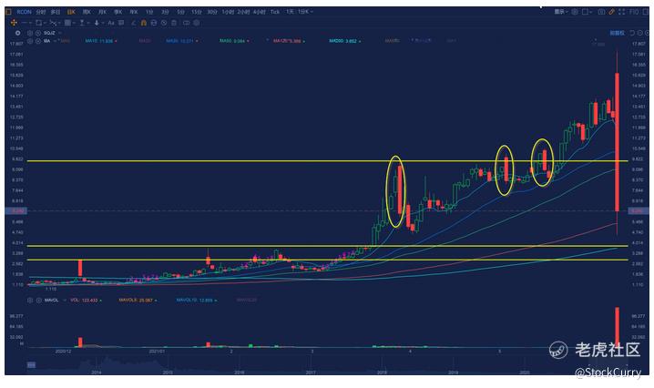 在买入之后第二天股价就开始了大幅回调,当天就跌了10%,第二天又跌了5%。可见这支股票洗盘幅度是非常的大,手法也比较狠。因为在5月5日涨到历史新高之后我并没有买入,因为我知道通常之后会有一波回调,所以又等他涨到了前高才建仓,没想到又来了一次洗盘。从历史来看这支股票也非常喜欢走大跌+吞噬线。图中画圈的都是大跌并走出了吞噬线给人一种股价要大幅回调的感觉,以达到洗盘的目的。