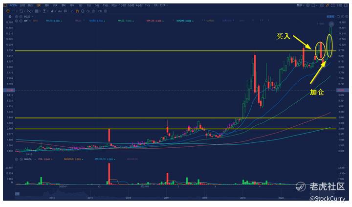 第一次买入这支股票是在5月17号,股价刚刚突破5月5日的大阴线,也就是历史新高。从图形上来看这支股票从去年1块左右,涨到了9块多,只用了三个月时间,爆发力非常的强。在3月30日达到高点之后马上来了一根大阴线,当时跌幅为30%,之后便开始了长达2个月的回调。