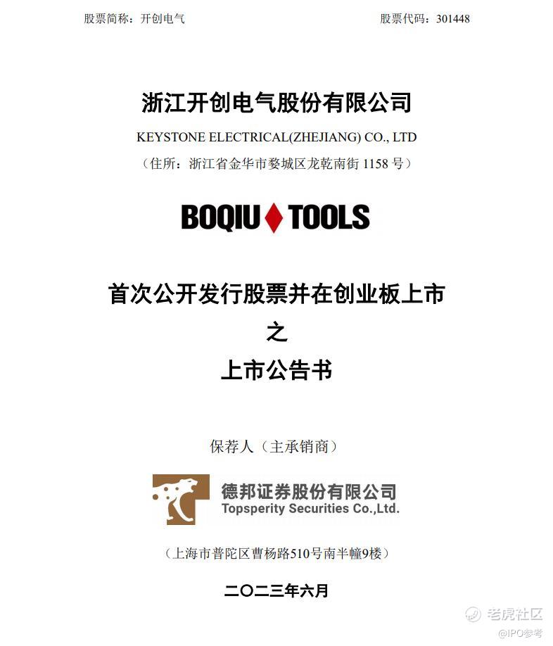 【开创电气将于6月19日在深交所上市】开创电气6月15日发布公告称,该公司股票将于6月19日在深交所创业板上市。该公司人民币普通股股份总数为8000万股,其中2000万股股票自上市之日起开始上市交易,发行价18.15元/股。(界面)