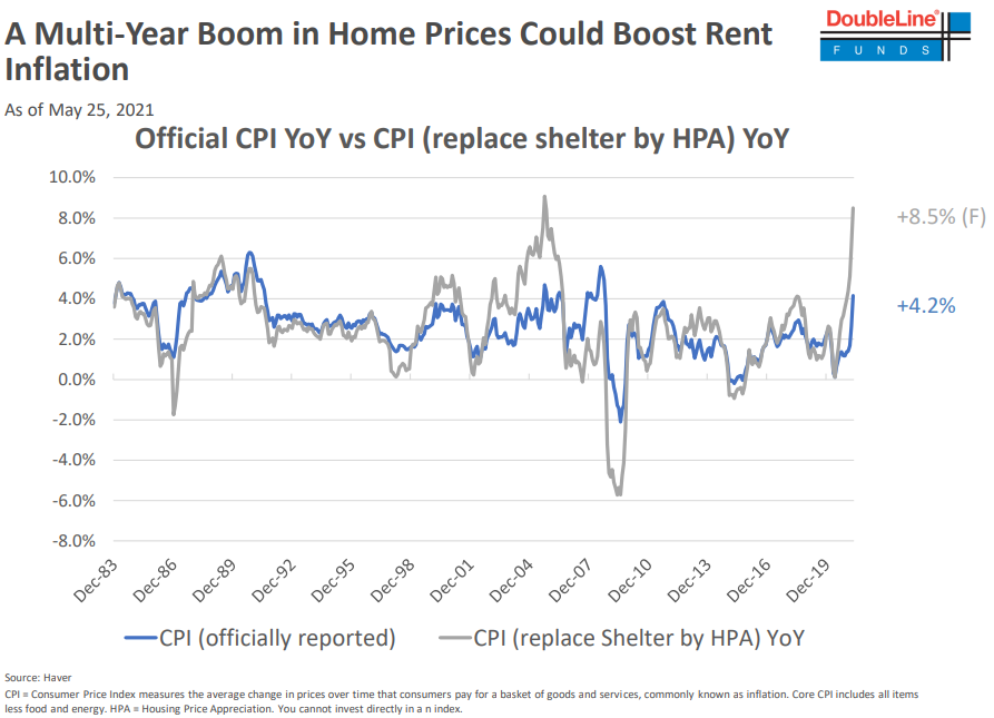 2) Gundlach自己的模型预测这个月(6月10号公布)的CPI会在高4%(即接近5%),有机会过5% (上个月4.2%)。问题是联储会如何应对5%以上的CPI。