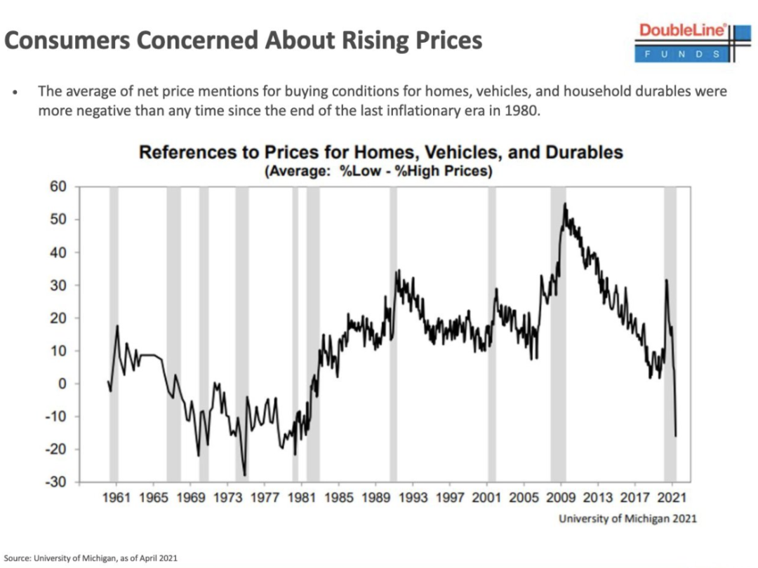1)Gundlach认为现阶段没人能肯定通胀是否是transitory,如果非要做出猜测,他觉得transitory的机会是60%。他认为通胀最大的问题是它有自我实现的倾向,因为人们会害怕未来通胀而现在去抢购商品。目前民众对通胀的担心已经接近卡特的大通胀时期。
