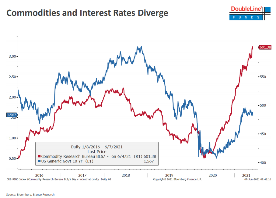 他认为商品在大涨之后短期内可能面临回调。目前商品和利率走势产生背离,按照商品的点位,10年美债利率应该在3%。