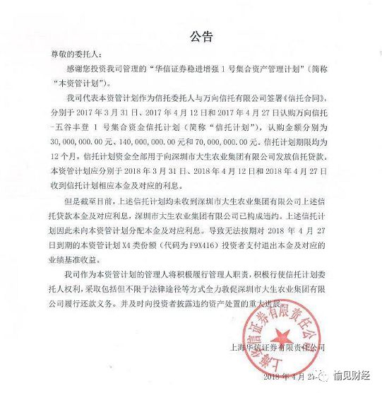 综上,大生农业无法到期偿付信托贷款——华信证券资管计划违约。