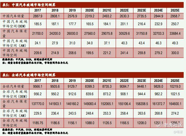 汽车玻璃市场空间测算 我们分别测算了中国/全球未来几年的汽车销量与保有量,汽车玻璃配套 OEM市场的单车价值量和配套AM市场的单车价值量,则可相乘得到汽车玻璃的市 场空间。
