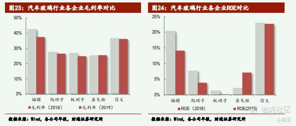 经过统计福耀与竞争对手的毛利率和ROE, 2019年福耀毛利率为37.5%,较此前几年稳定42%的水平有所下滑,但仍远高于体 量相当的旭硝子(26.5%)、板硝子(26.2%,板硝子为2018年数据)、圣戈班(25.5%), 与体量较小的信义玻璃(36.2%)相当。2019年福耀ROE为14.1%,显著高于体量 相当的旭硝子(3.9%)、板硝子(10.3%,板硝子为2018年数据)、圣戈班(7.1%), 低于体量较小的信义玻璃(22.7%)。由此可见,在全球汽车玻璃一线巨头中,福 耀盈利能力明显高出一档。