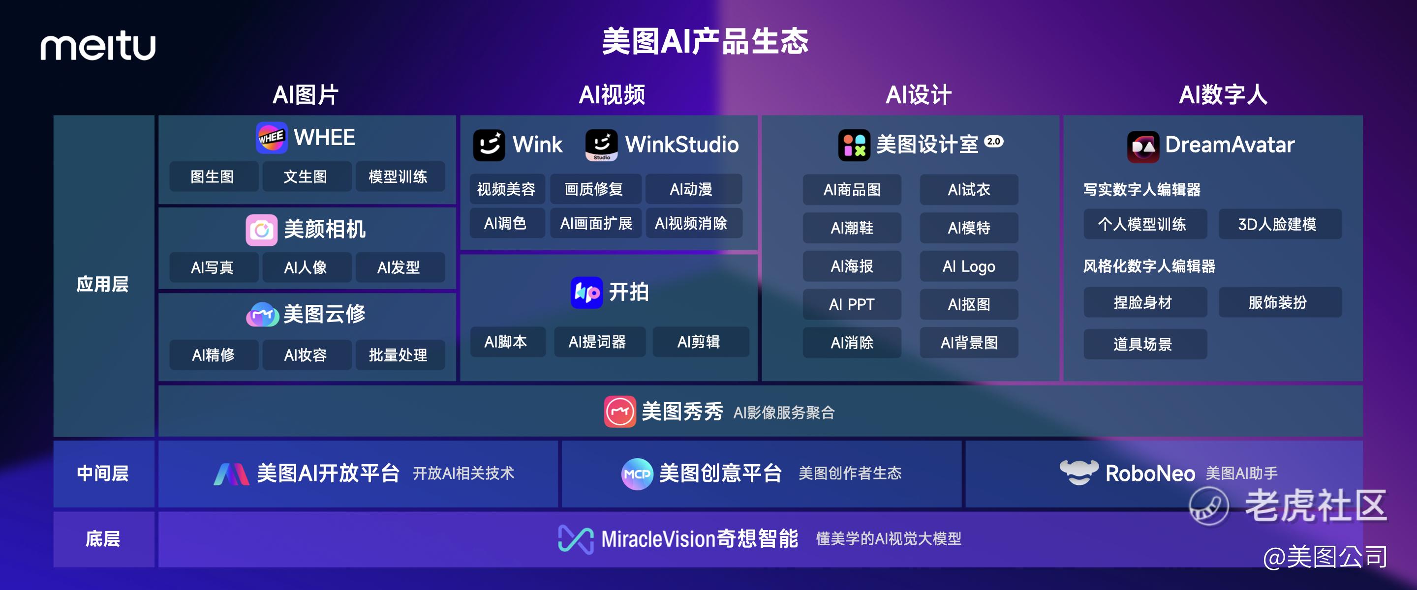 底层则是MiracleVision视觉大模型,为美图全系产品提供AI模型能力。
