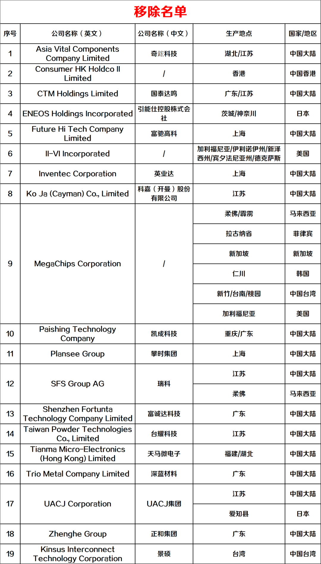 有13家中国厂商从苹果供应链中被剔除。这些厂商包括CTM Holdings Limited、Consumer HK HoldcoII Limited、富驰高科技、凯成科技、深圳市富诚达科技、深蓝材料、正和集团、天马微电子,以及中国台湾的奇鋐、英业达、景硕、科嘉和台耀科技。