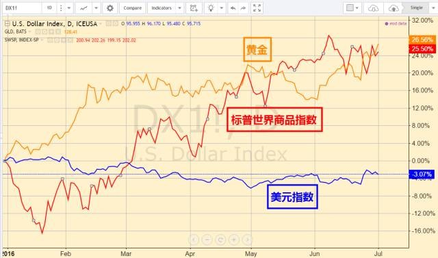 我们可以看到, 美元几乎是死水一潭 - 年内仅仅跌了3%, 而黄金和标普世界商品指数却迎来了一波大爆发, 均暴涨25%以上.