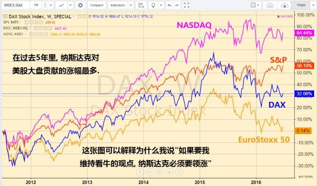 最后我们来看看, 最近5年的对比. 你们可以发现, 在过去的5年里, 纳斯达克对美股贡献的涨幅最大. 标普紧随其后, DAX也有32%的涨幅. 唯独E50 - 由欧洲最大的50家蓝筹所组成的"欧洲道琼斯", 一路走熊, 几乎抹平了5年间的所有涨幅.