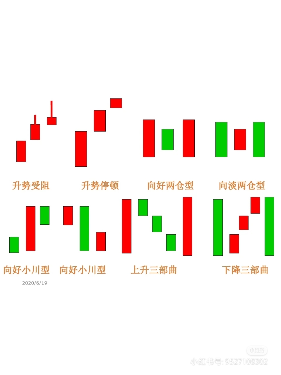四、上影线特别长而实体只是一条横线的 K 线。又称为上升转折线,表明当天的收盘价与开盘价相同,当天买方没有获得进展,买卖双方的实力旗鼓相当。这种 K 线大多出现在股价的顶部。五、上影线大于实体1.5倍以上的阴线。这种阴线表明买方当天被卖方击败,股价收在当天开盘价之下,如果没有低于昨天的收盘价,买方只是暂时受挫,如果低于昨天的收盘价,进入调整或者是下跌将是必然的。此种 K 线大多出现在顶部和下跌途中。六、上影线与实体相当的阴线。表明卖方稍占上风,买方偏弱,在整理中有时会出现这种 K 线,其意义不是很大。七、上影线小于实体的阴线。在大幅下跌中最为常见,表明卖方气势汹汹,买方溃不成军。