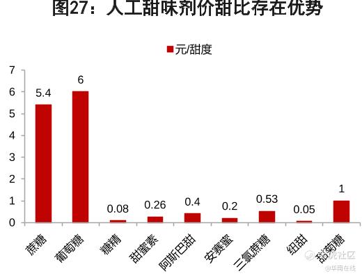 另外,在成本方面,尽管人工代糖的“甜价比”(即获得单位甜度口感的价格)优势明显,可以最大化地控制和压缩成本,但甜菊糖苷的甜价比也已经下降到蔗糖的五分之一,也只是阿斯巴甜的2.5 倍,并且一瓶饮料里高倍甜味剂添加量少之又少,因此对品牌方来说,单瓶甜味剂应用成本的浮动基本可以忽略不计。