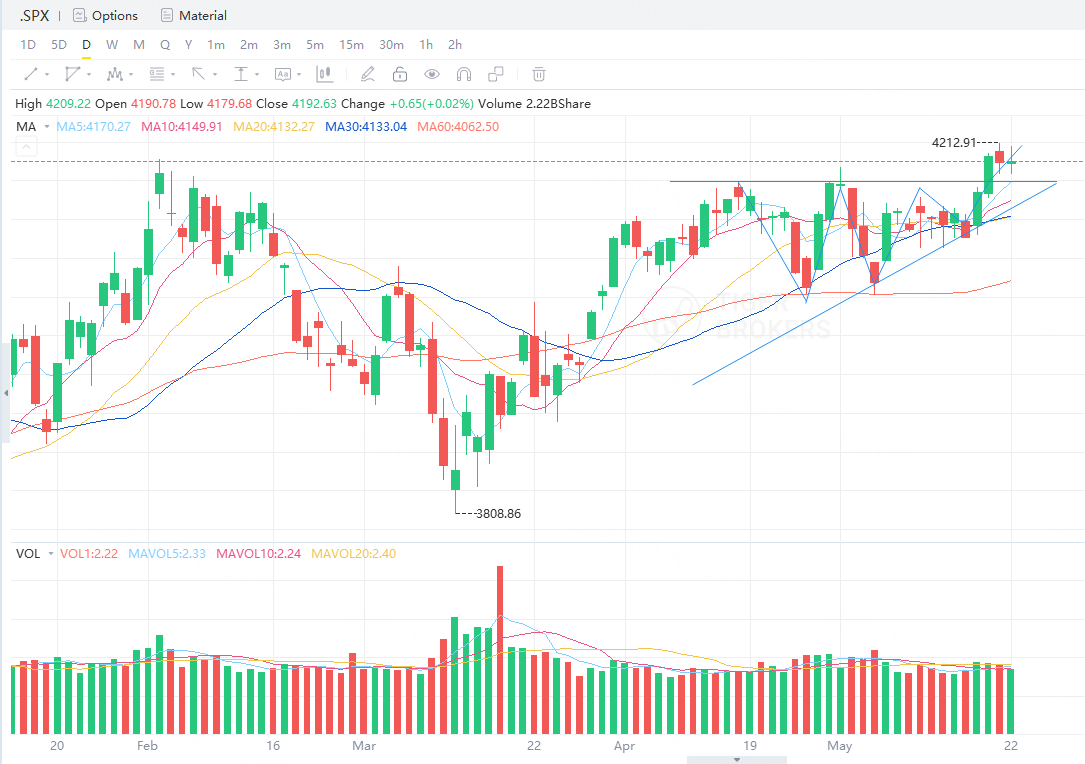 在 2023 年 4 月至 2023 年 5 月期间,SPX形成了一个明显的上升三角形,支撑线逐渐上升,而阻力线维持水平,最终技术形态突破了阻力线继续走高。