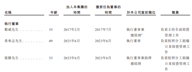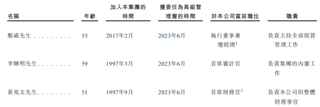 高管包括:执行董事兼总经理郑威先生,首席审计官李辉明先生,首席财务官黄兆文。