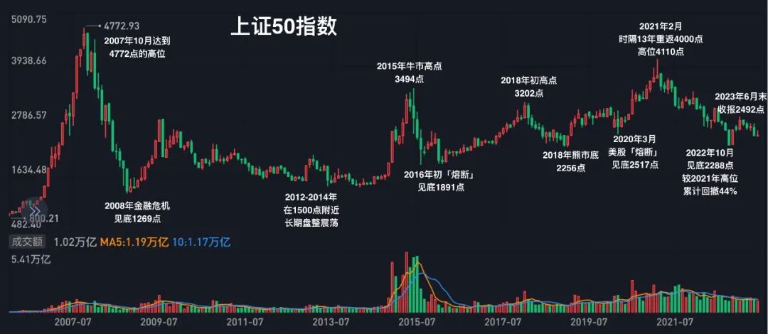 指数过往表现上证50指数目前的最高点为4772.93点,出现在2007年10月牛市巅峰之时,一年后的2008年最低跌至1269点,随后直到2015年才再次重返3000点大关。