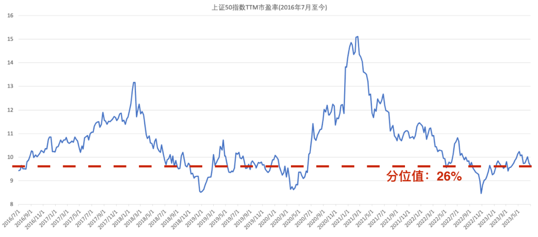 截至2023年6月30日收盘,上证50最新市盈率为9.66,估值位于2016年7月以来的26%分位。关于指数估值的最新数据和更多讨论可点击查看《估值分析》合集2016年7月以来,上证50的市盈率中位数大约是10.2左右。在2018年初和2021年初的两次阶段高位,指数市盈率曾达到过13倍和15倍。2022年10月,指数见底2288点,较2021年初高位累计回撤44%,上证50市盈率降至8.4,创历史阶段新低。