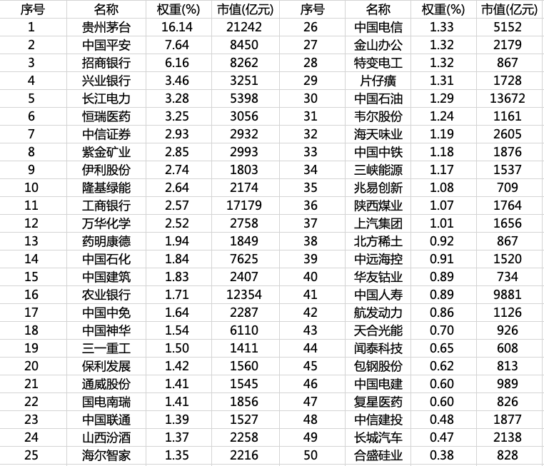 上证50指数由沪市中规模大、流动性好的最具代表性的50只股票组成,反映上海证券市场最具影响力的一批龙头公司的股票价格表现。热门成分股有工商银行、招商银行等银行股,茅台、伊利、海天味业等食品饮料消费题材,平安、人寿等保险题材,中国建筑、中国石油等中字头个股,隆基、长江电力等新能源龙头,药明康德、恒瑞医药等生物医药龙头,以及兆易创新、韦尔股份等科技前沿公司等等。根据指数编制方案,上证50指数每半年进行一次成分股样本调整。本期变动:新调入中国电信、中国联通、特变电工、金山办公、中国中铁5家公司;恒力石化、海螺水泥、中国太保、华泰证券、中金公司被调出指数。上证50成分股总市值约18亿元,约占整个沪市市值的3~4成。