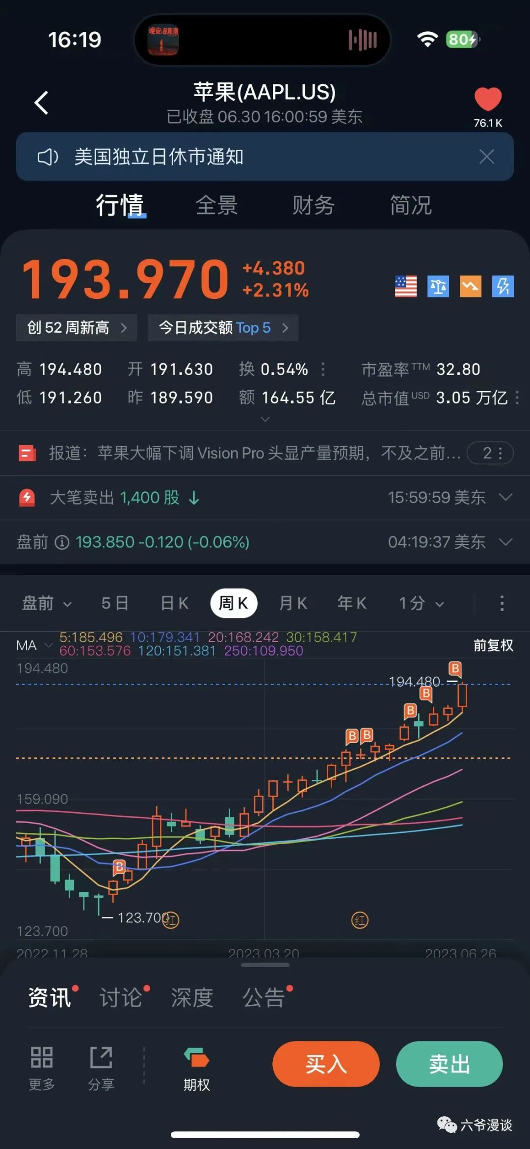 一直等苹果回调,结果就是不回调,只能被迫小仓位加仓了。上周五又破历史新高了。