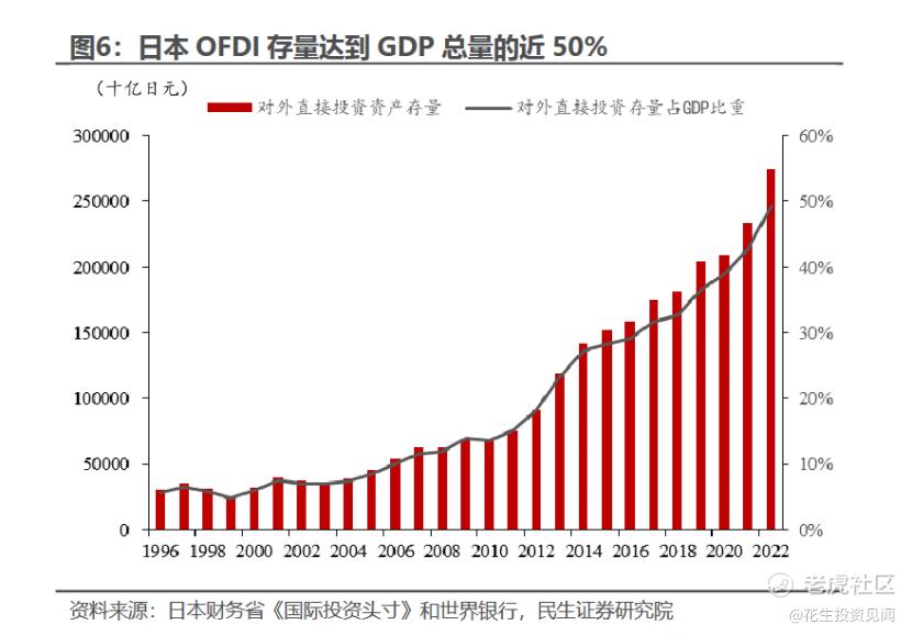 1996年,日本对外投资规模存量30.6万亿日元,占GDP比重仅为5.7%。26年之后的2022年,日本对外直接投资规模存量已达到274.7万亿日元,规模翻了8倍,占日本当年GDP总量的比例已达到49.4%。