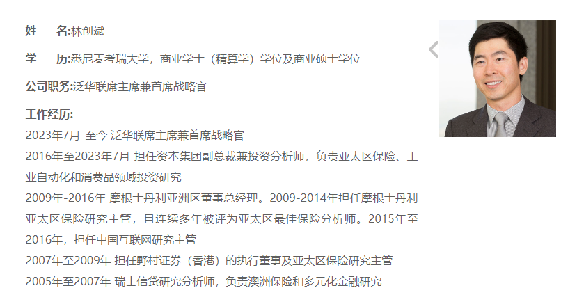林创斌,毕业于悉尼麦考瑞大学,获得商业学士(精算学)学位和商业硕士学位。他曾于多家知名金融机构担任重要职位,对全球保险行业有着深入的了解。2016年至2023年,他担任资本集团副总裁,兼任亚洲保险和工业行业投资分析师。公开资料显示,他曾担任摩根士丹利(Morgan Stanley)董事总经理,负责中国互联网行业和亚洲保险行业研究。